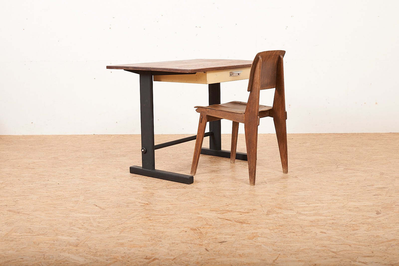 Table Jean PROUVE from www.ablor.com Piètement tôle d'acier pliée, plateau revêtement en aggloméré stratifié la table présente de nombreuses rayures et des marques liées à son usage. Le corbusier designated prouvé a constructeur, blending architecture and engineering. #table#design_ jean prouvé 1950 #guéridon_cafétéria#acajou 105 x 72 cm.